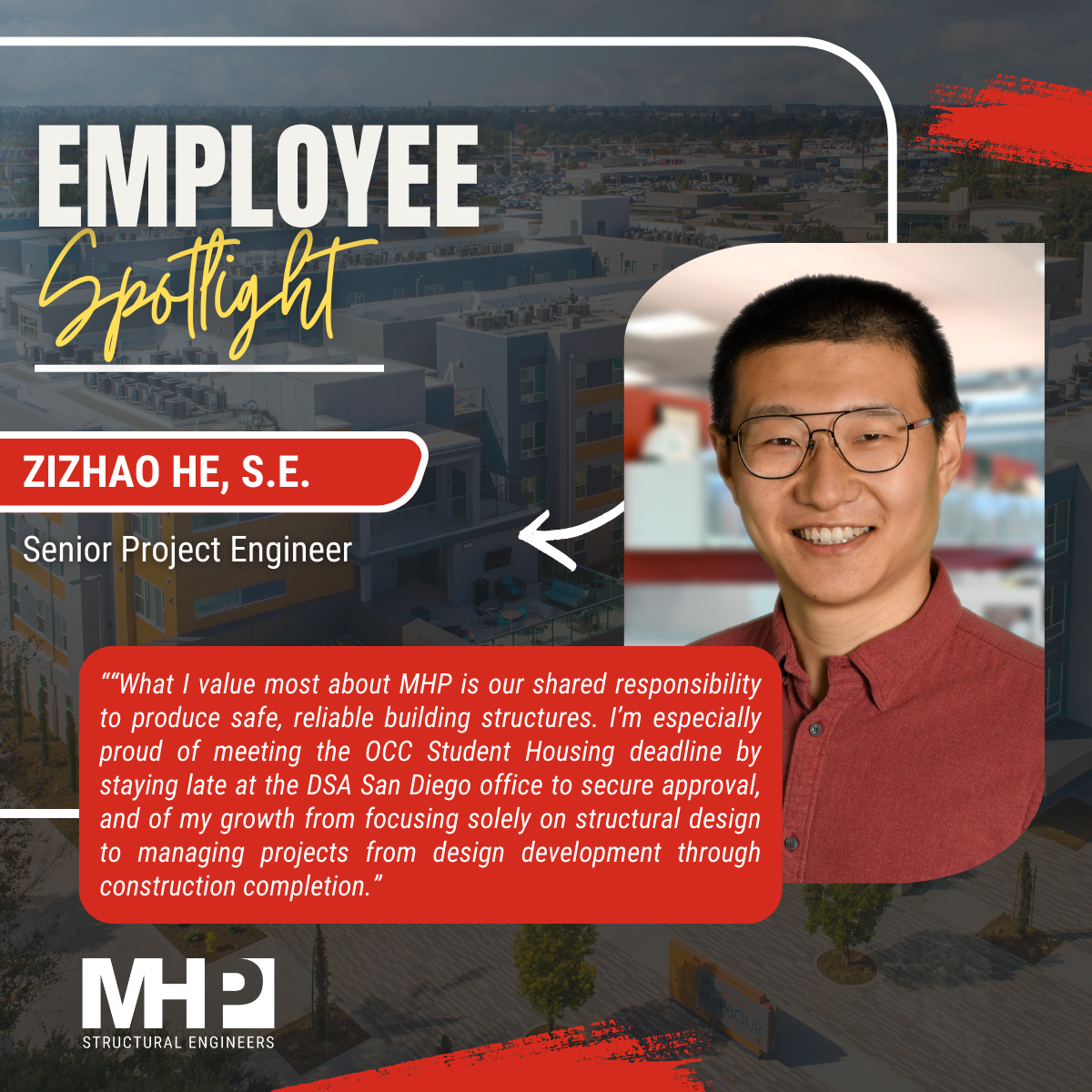 Zizhao (Zee) He, S.E. joined MHP in 2018 after gaining valuable experience with other engineering firms. He holds a B.S. in Civil Engineering from Beijing University and an M.S. in Structural/Earthquake Engineering from UCLA.